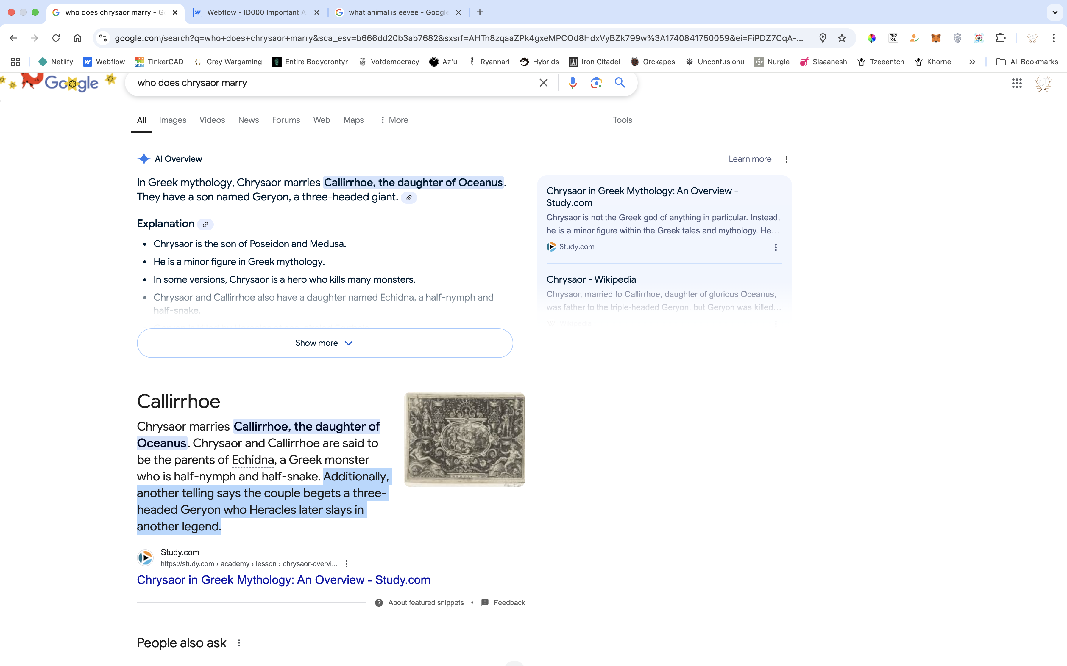Emperor (Chrysaor) and Empress (Callirrhoe) have a son (3 headed giant) that is slain by Hercules (Richards son)